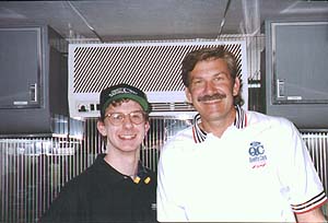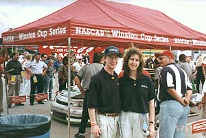 ![]() | During the afternoon before the race, we were in the pit area, just looking around. It rained pretty hard that afternoon, and there wasn't much of anything going on. We were standing by Dale Jarrett's trailer and talking to one of the crew members who had ties with Ford. I said I was a DJ fan and later he asked if we'd like to meet him! This photo was taken in the trailer after we had talked to DJ for a little bit. (Some have said that DJ and I smile alike) |