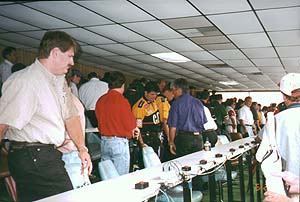 ![]() | The driver's meeting takes place before every race, and all the rules and regulations unique to that track are reviewed. We were lucky enough to just slip in the side door and listen in. The really great thing that they do is pray for safety during the race. This photo was taken after the drivers had been dismissed. It was incredible to be in the same room with Dale Earnhardt, Jeff Gordon, Bill Elliot, Rusty Wallace, Mark Martin, and Dale Jarrett. I still can't believe we got in! |