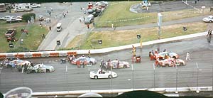 ![]() | The cars were all lined up in front of pit road before the race, and here the crews are pushing them towards their spots on pit road itself. Dale Jarrett's #88 Ford Thunderbird is the fourth car in line in this photo. |
