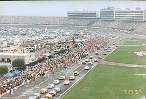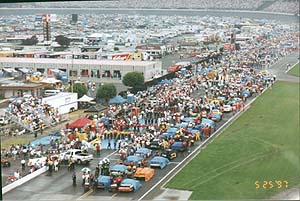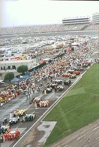 ![]() | Here you can see the rest of the cars being pushed down pit road before the national anthem. You can still see the tire tracks in the infield from the pre-race military demonstration. |