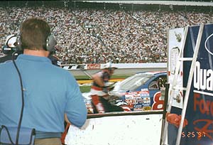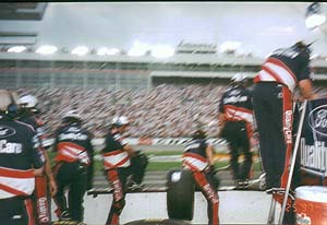 ![]() | We deceided to go down to the pits to see a real Winston Cup pit stop up close. It will probably be my only opportunity, and boy was it a memerable one. Here you can see DJ's crew up on the wall, ready to get him in and out without losing the lead... |